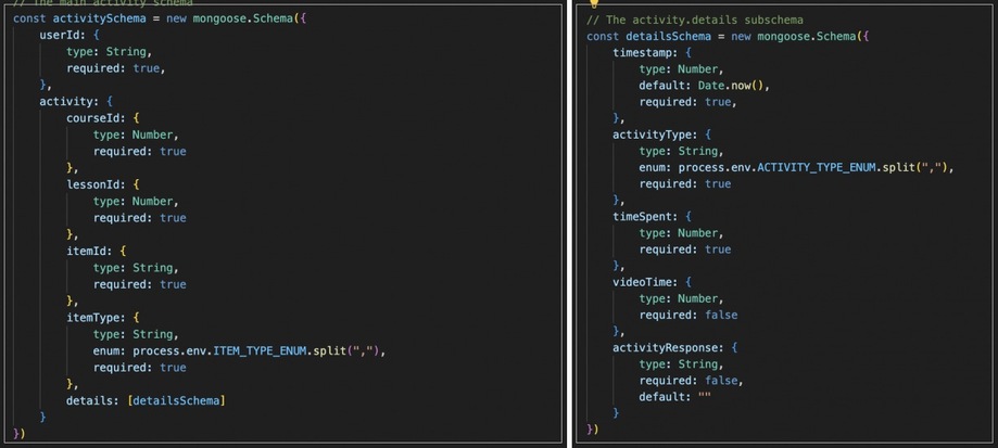 I was honored to be part of the Data Modeling Team, where our first task was to design a schema that supported both user-specific and platform-wide activity tracking. For example, the client wanted to track individual user activity while also being able to analyze aggregated activity across all users for a specific lesson, such as "Korean 101 - Quiz 1." To achieve this, we designed a hierarchical data structure in MongoDB that allowed for efficient querying and analysis. Once we had a solid data schema, we moved on to developing the backend and connecting it to MongoDB Atlas.